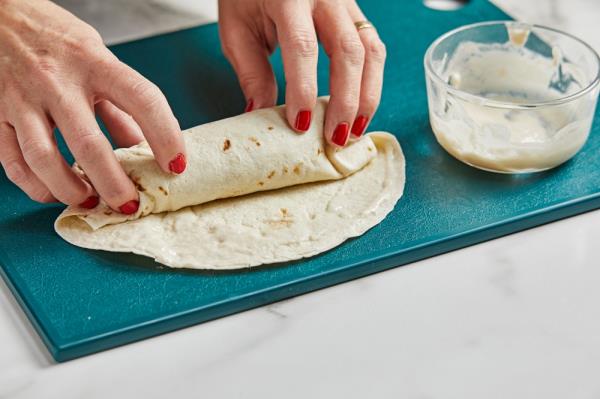 要做墨西哥卷饼,先放一个玉米饼,用勺子舀1/2杯的豆子混合物到玉米饼上,大约从底部往上三分之一的地方。用刷子或手指将面粉浆沿着玉米饼的上边缘涂抹。把玉米饼从底部叠在馅料上,把它塞进去,形成一个圆柱体,然后把两边折叠起来,继续从底部滚下去,把两边塞好,尽量把包装压紧。按压接缝以帮助密封。重复剩下的玉米饼和馅料,当你工作的时候把它们的接缝面朝下放在盘子里。