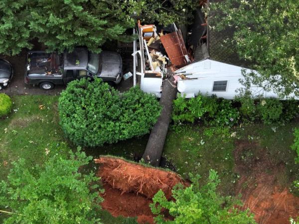 官员们在该市网站上的一篇文章中说,风暴将一棵大树连根拔起,这棵大树倒在一户人家的房子上,从屋顶刮了下来,落在了一名妇女和她两岁大的孩子睡觉的床上。工作人员工作了近一个小时,拆除了屋顶和部分树木,然后把树抬起来,把受害者救了出来。