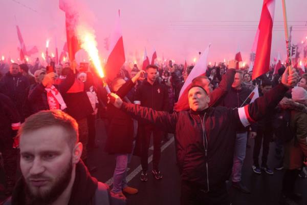 参与者举着波兰的红白相间的国旗,一些人点燃了照明弹,沿着从市中心到国家体育场的路线行进。