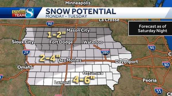 届时,雨和雪的混合将从西南部进入爱荷华州,在晚上变成只有雪,并在周一晚上到周二早上覆盖该州的大部分地区。爱荷华州南部降雪最多,目前预计降雪4-6英寸。据预报,得梅因地区的降雨量为2-4英寸,爱荷华州北部的降雨量较小。