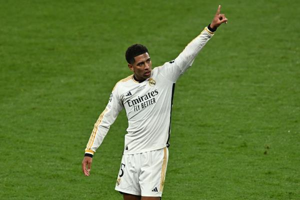 2024年6月1日,在伦敦温布利体育场举行的欧洲冠军联赛决赛中,皇家马德里队的英格兰中场裘德·贝灵汉在下场时向球迷挥手致意。(图片来源:本·斯坦索尔/法新社)