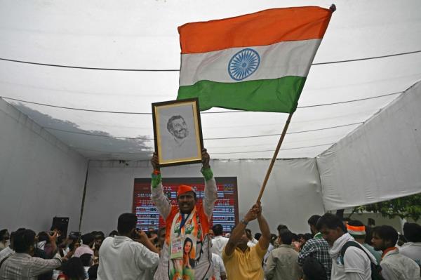 印第安民族的支持者部分公司国大党高举总统拉胡尔·甘地的画像,挥舞印度国旗2024年6月4日,新德里,庆祝计票结果的国旗。(图片来源:Arun Sankar /法新社)