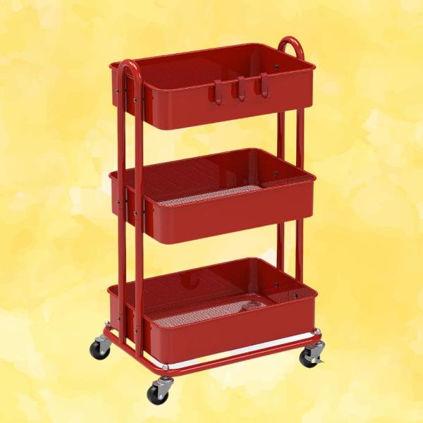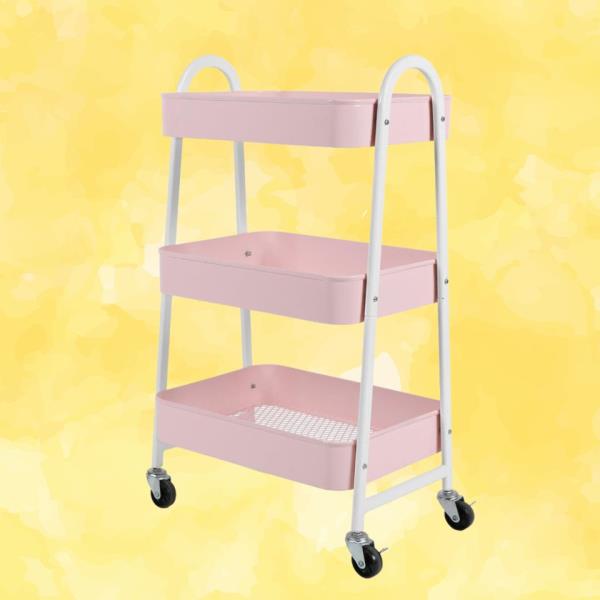 添加一个流行的颜色,这个粉红色的多功能车来自亚马逊(也有黑色或白色为那些喜欢更微妙的氛围)。它有宽敞的架子,底部是网状的,还有一个三角形的架子