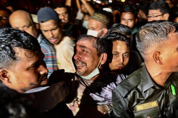 2024年2月29日,达卡一座商业大楼发生火灾,造成至少43人死亡,消防员在进行救援行动时,一名公众做出反应。(图片来源:Munir Uz Zaman /法新社)
