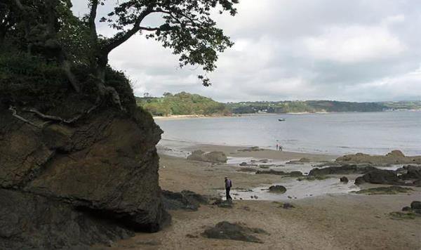 完美的家庭外出,海滩背后是低悬崖和茂密的林地,彭布罗克郡海岸小径穿过。