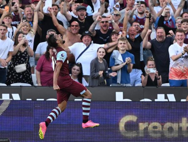 卢卡斯·帕奎塔在西汉姆联3-1战胜切尔西的比赛中打入第三球后庆祝伦敦体育场,2023年8月20日