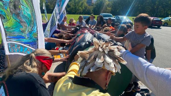 这个图腾柱高10多英尺,重达两吨多。周一,当它在一辆平板车的后面滚进霍河时,30人将手放在它的彩木上,为它所保护的“神圣”水道祈祷。