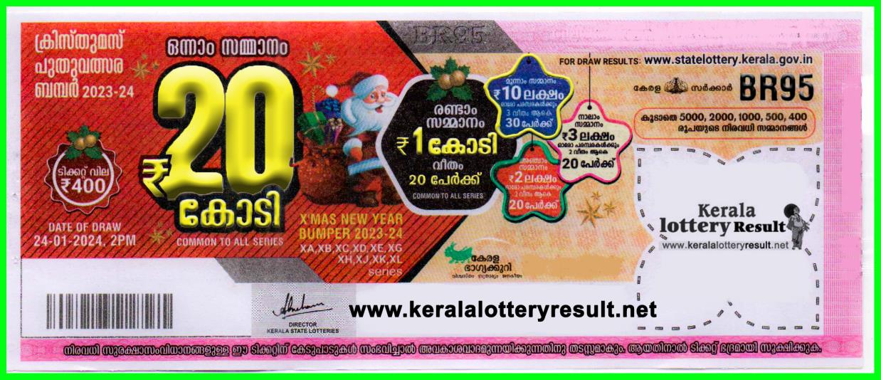 喀拉拉邦彩票部门将于2024年1月24日举行圣诞新年BR-95幸运抽奖。一等奖获得者将获得2亿卢比。你可以试试运气,从邦内的授权代理商处购买价值400卢比的机票。