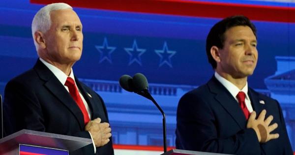 Republican presidential candidates former Vice President Mike Pence and Florida Gov. Ron DeSantis stand on stage before a Republican presidential primary debate on Wednesday, Aug. 23, 2023, in Milwaukee.