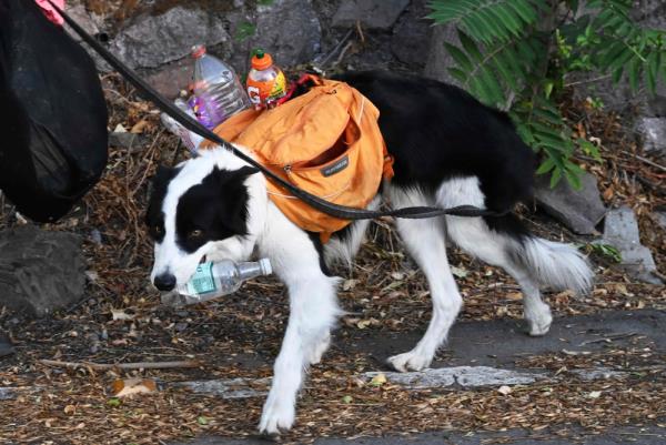 运动员和律师走吧2024年3月12日,在圣地亚哥的圣克里斯托瓦尔营地,纳萨洛·蒋在宠物山姆的陪同下,将塑料瓶放入回收站。罗德里戈·阿兰瓜/法新社摄