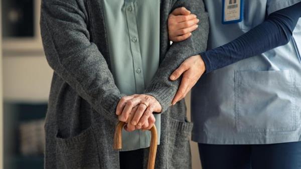 Nurse assisting senior with walking cane