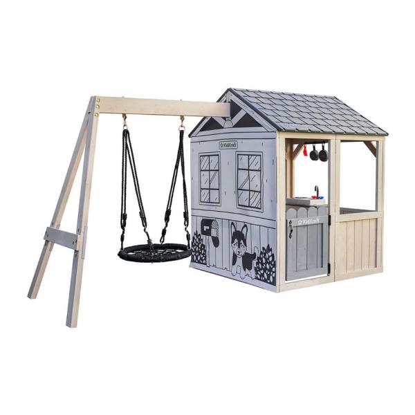 KidKraft户外木制秋千游戏屋(打七折)这个游戏区非常适合三岁及以上的孩子,包括一个网秋千和带水槽、水龙头、燃烧器和其他配件的游戏厨房。它有一面带有插图的轻质织物墙和一扇带磁性门闩的半扇门。