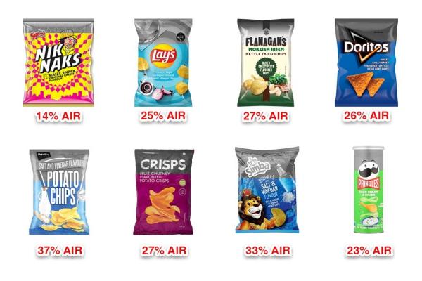 高端的异常值是Simba和Pick n Pay自有标签芯片,它们类似于Simba芯片。这些袋子分别含有33%和37%的空气。